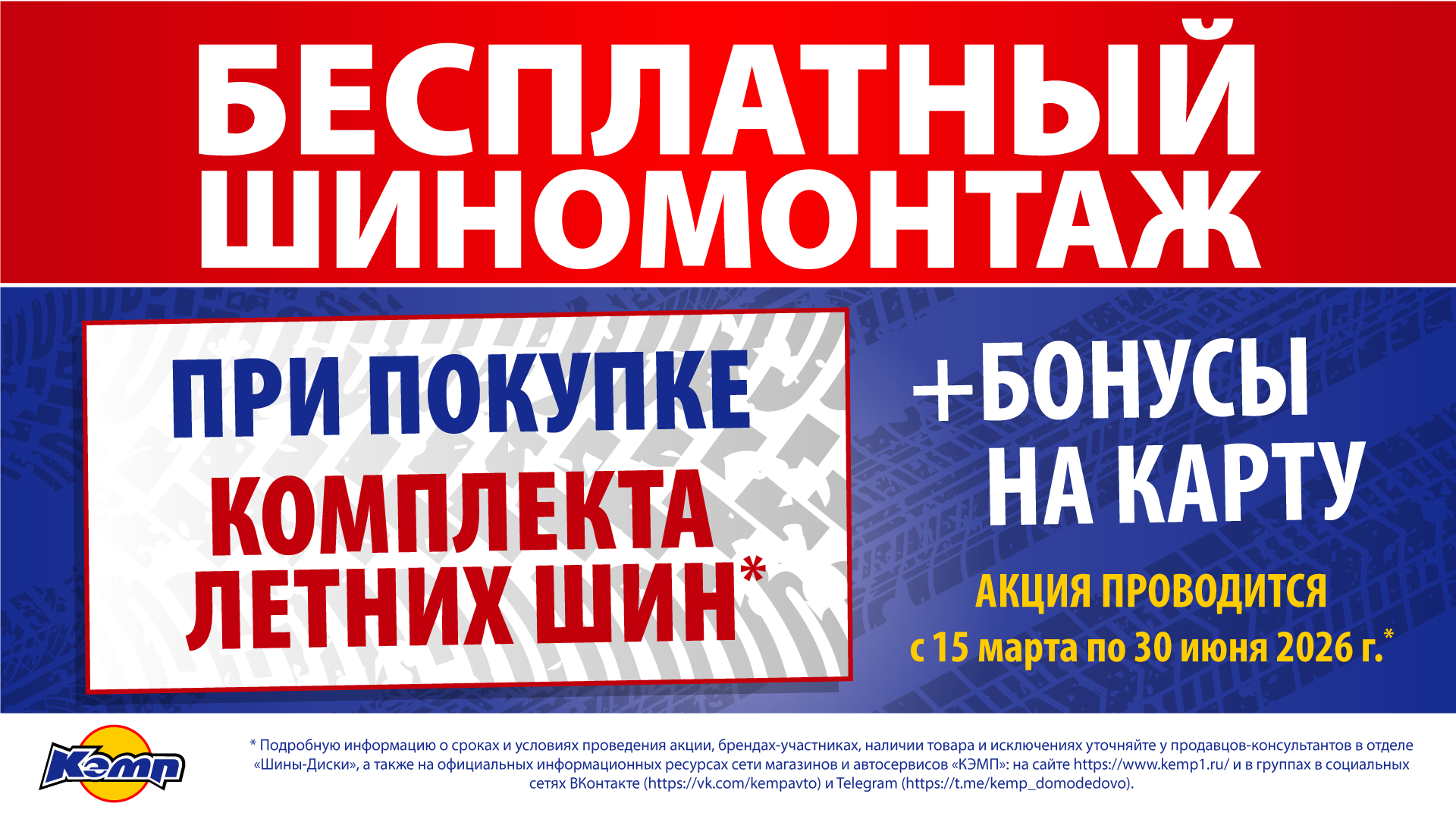 С 15 марта по 30 июня 2026 г. при покупке комплекта летних автошин от 15 и выше посадочного диаметра вы получаете купон на услугу «БЕСПЛАТНЫЙ ШИНОМОНТАЖ» + бонусы на карту лояльности.