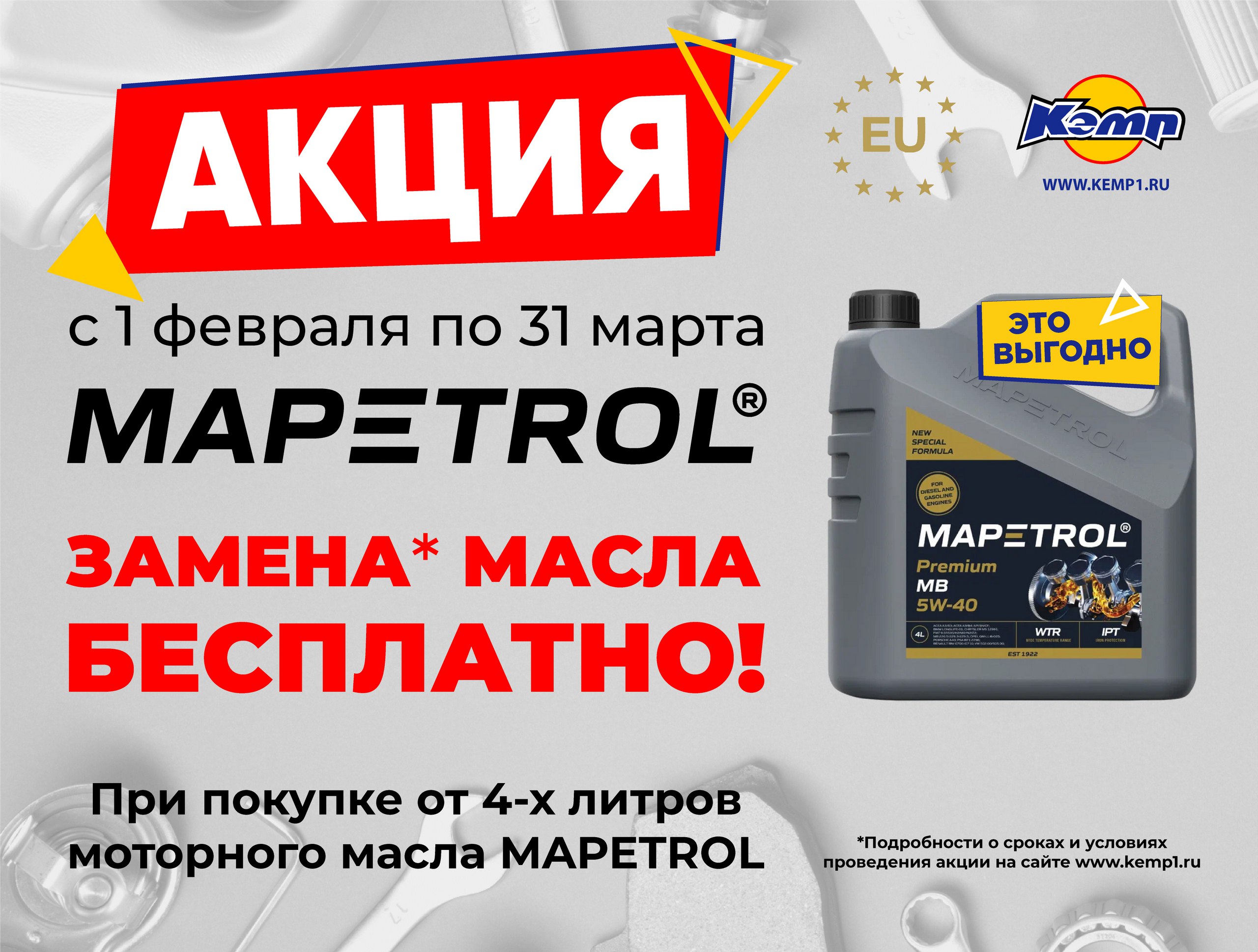 Акция действует ТОЛЬКО в 2 торговых точках сети магазинов и автосервисов «КЭМП», а также при покупке от 4 литров моторного масла MAPETROL в интернет-магазине: