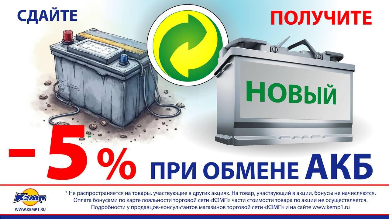 Если вам нужна новая аккумуляторная батарея (АКБ) для вашего автомобиля, не спешите избавляться от старой! КЭМП поможет не только избавиться от ненужной вещи, но и выгодно приобрести новую АКБ.