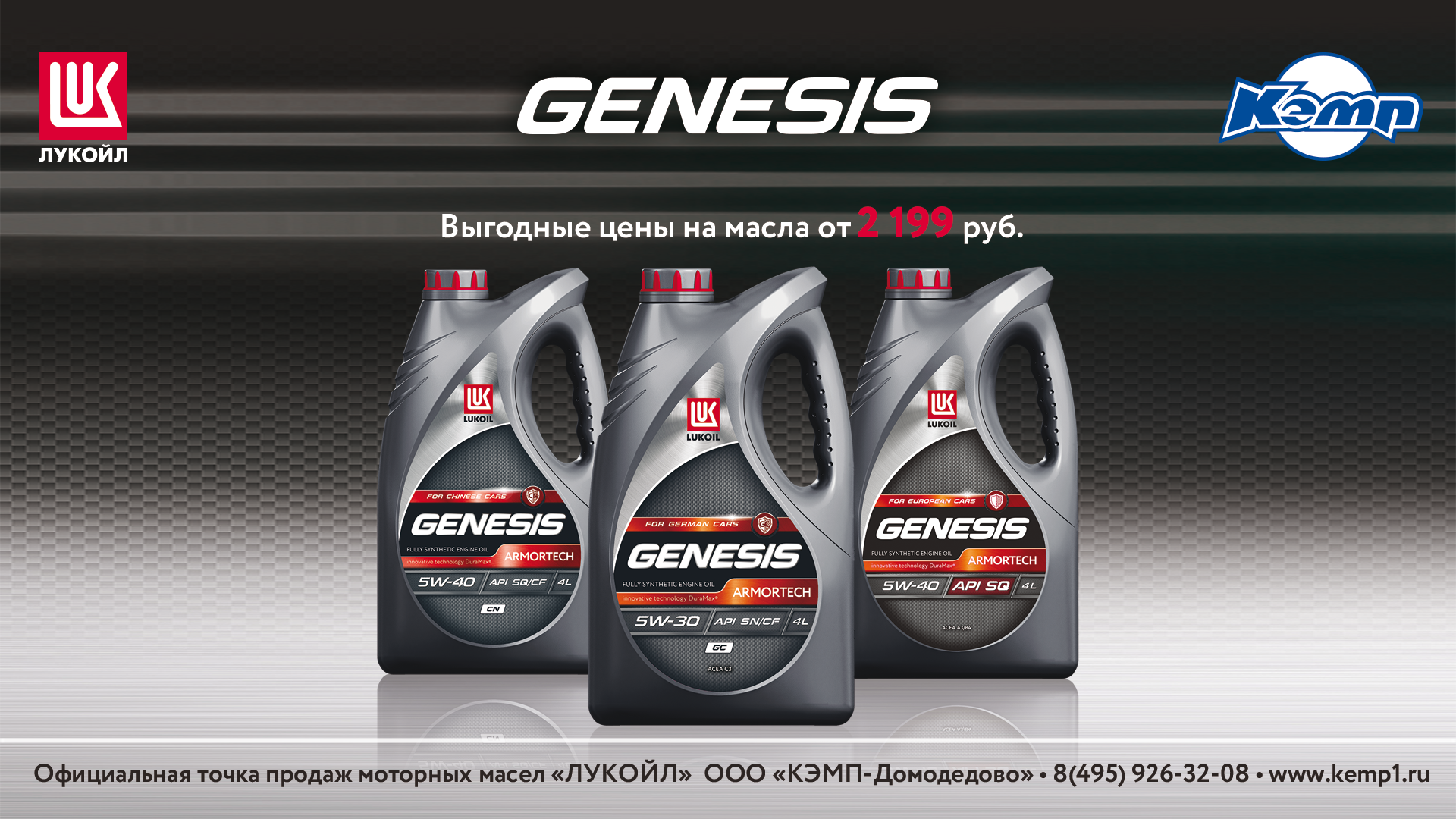 Важно, чтобы каждый водитель заботился о безопасной эксплуатации своего автомобиля. В этом помогут высококачественные масла ЛУКОЙЛ, которые обеспечивают надёжную работу двигателя. В торговой сети «КЭМП» моторные масла LUKOIL линейки GENESIS для вашего автомобиля с максимальной выгодой — от 2 199 рублей.