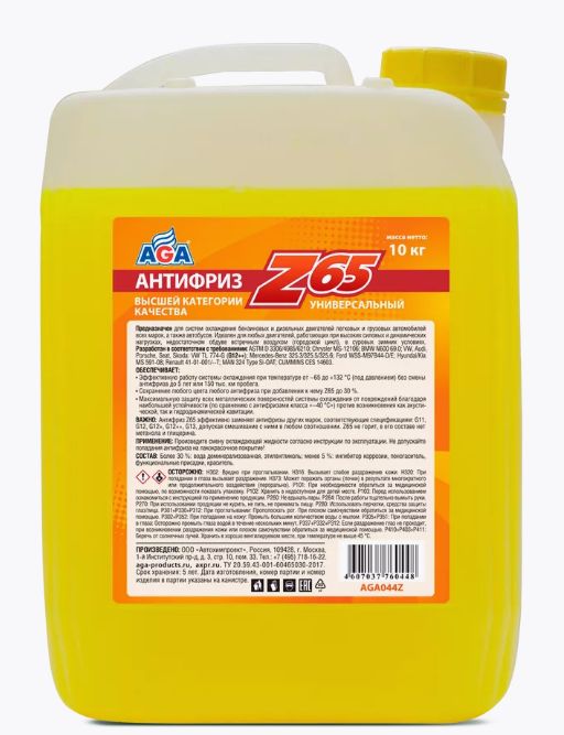 Антифриз AGA 044Z — это высококачественная охлаждающая жидкость, предназначенная для использования в системах охлаждения двигателей внутреннего сгорания. Она разработана специально для применения в условиях холодного климата и обеспечивает надёжную защиту от замерзания и коррозии. Основные характеристики антифриза AGA 044Z: -температура начала кристаллизации составляет -65 °С; -плотность составляет 1,07 г/см³ при +20 °С; -кинематическая вязкость составляет 10 мм²/с при +20 °С и 6 мм²/с при -30 °С; -щёлочность составляет 14,5 см³; -водородный показатель (рН) составляет 8,2; -температура кипения составляет +110 °С. Антифриз AGA 044Z соответствует требованиям ASTM D 3306, SAE J 1034 и BS 6580. Он подходит для использования в легковых и грузовых автомобилях, автобусах, строительной и сельскохозяйственной технике, а также в стационарных установках.