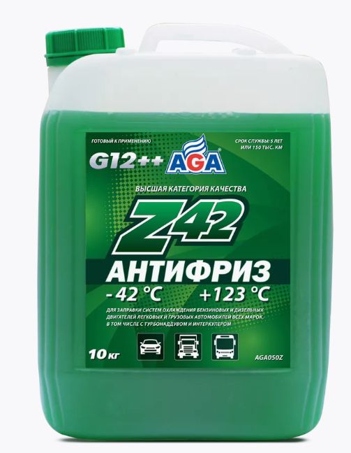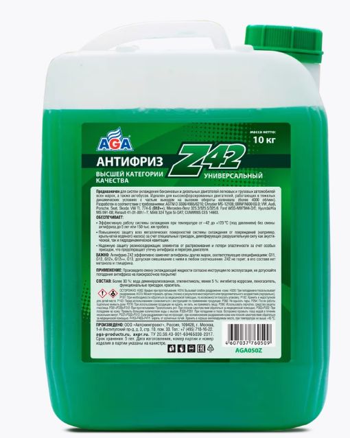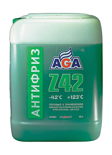 Антифриз AGA-Z42 — это универсальный охлаждающий агент, предназначенный для использования в системах охлаждения бензиновых и дизельных двигателей легковых и грузовых автомобилей, а также автобусов. Он идеально подходит для высокофорсированных двигателей, работающих в тяжёлых динамических условиях с частым выходом на высокие обороты коленчатого вала. Этот антифриз соответствует различным спецификациям и требованиям, таким как ASTM D 3306/4985/6210, Chrysler MS-12106, BMW N600 69.0, VW, Audi, Porsche, Seat, Skoda, Mercedes-Benz, Ford и Hyundai/Kia. Его рабочий температурный диапазон составляет от -40 до +123 °C, а срок службы достигает 5 лет или 150 000 км пробега. Антифриз AGA-Z42 содержит специальные присадки, которые «прилипают» к металлическим поверхностям и демпфируют разрушительную силу ударной волны при схлопывании газовых пузырьков. Он также надёжно защищает резиносодержащие элементы системы охлаждения от растрескивания и набухания, предотвращая выход двигателя из строя из-за утечки антифриза.