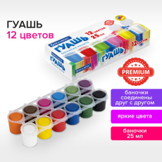 Гуашь BRAUBERG "PREMIUM", 12 цветов по 25 мл, 191700 PREMIUM по 25мл