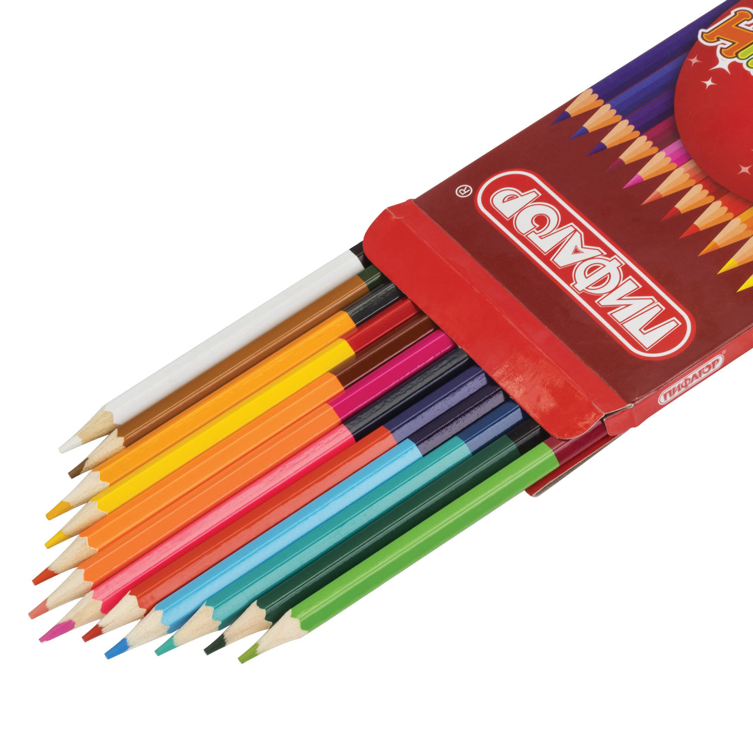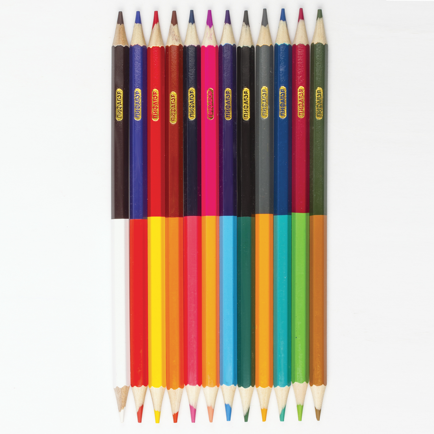 Двусторонние цветные карандаши ПИФАГОР предназначены для детского творчества. Отличный вариант для школьного пенала.<br>Двусторонние цветные карандаши ПИФАГОР предназначены для детского творчества. Отличный вариант для школьного пенала.Набор состоит из 12 карандашей и 24 цветов: черный-белый, синий-красный, алый-желтый, бордовый-оранжевый, розовый-темно-синий, фуксия-канареечный, голубой-фиолетовый, зеленый-коричневый, персиковый-серый, бирюзовый-синий, салатовый-пурпурный, коричневый-темно-зеленый. Шестигранная форма сечения корпуса позволяет не скатываться карандашу с поверхности стола во время занятий рисованием. Они изготовлены из высокосортной белой древесины ценных пород и имеют лакированный корпус. Качество древесины и исполнения гарантируют легкую заточку. Грифель из натуральных материалов и пигментов диаметром 3 мм обладает повышенной прочностью. Все карандаши заточены с двух сторон и поставляются в картонной упаковке с европодвесом.<br>Двусторонние цветные карандаши ПИФАГОР предназначены для детского творчества. Отличный вариант для школьного пенала.Набор состоит из 12 карандашей и 24 цветов: черный-белый, синий-красный, алый-желтый, бордовый-оранжевый, розовый-темно-синий, фуксия-канареечный, голубой-фиолетовый, зеленый-коричневый, персиковый-серый, бирюзовый-синий, салатовый-пурпурный, коричневый-темно-зеленый. Шестигранная форма сечения корпуса позволяет не скатываться карандашу с поверхности стола во время занятий рисованием. Они изготовлены из высокосортной белой древесины ценных пород и имеют лакированный корпус. Качество древесины и исполнения гарантируют легкую заточку. Грифель из натуральных материалов и пигментов диаметром 3 мм обладает повышенной прочностью. Все карандаши заточены с двух сторон и поставляются в картонной упаковке с европодвесом.Количество цветов: 24. Форма сечения корпуса: шестигранная. Материал корпуса: дерево. Лакированный корпус: да. Грифель повышенной прочности: да. Заточка грифеля: да. Легко затачиваются: да. Диаметр грифеля: 3 мм. Длина карандаша: 176 мм. Упаковка: картонная коробка c европодвесом Бренд - ПИФАГОР. Производитель - Китай. Артикул - 180244. Штрихкод - 4606224002262