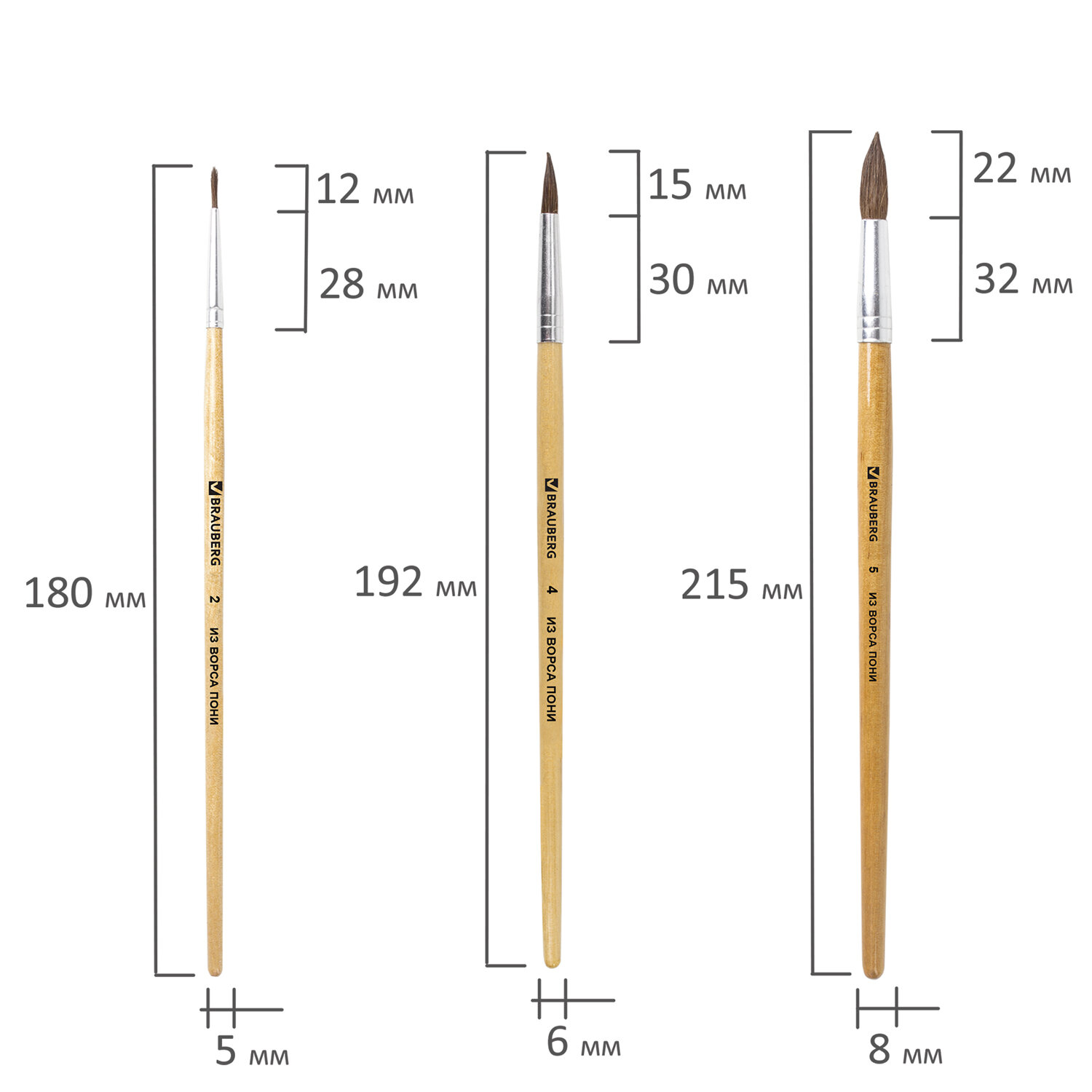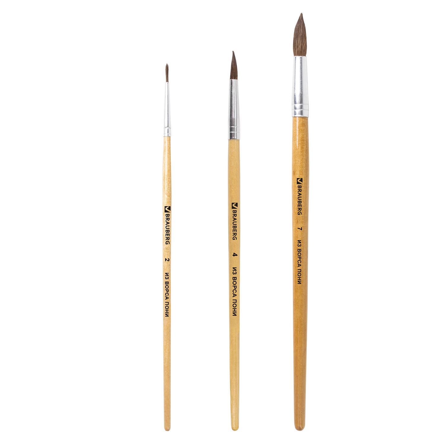 Набор из трех кистей разного размера BRAUBERG позволяет начинающим художникам решать любые творческие задачи в детском саду, школе и дома.Кисти из волоса пони отлично впитывают и отдают краску, хорошо держат форму, долговечны и надежны. Благодаря кисти №2 ребенку будет комфортно прорисовывать мелкие детали. Кисти №4 и 7 позволят делать более крупные мазки и линии. Деревянную лакированную рукоятку кисти удобно держать в руке.