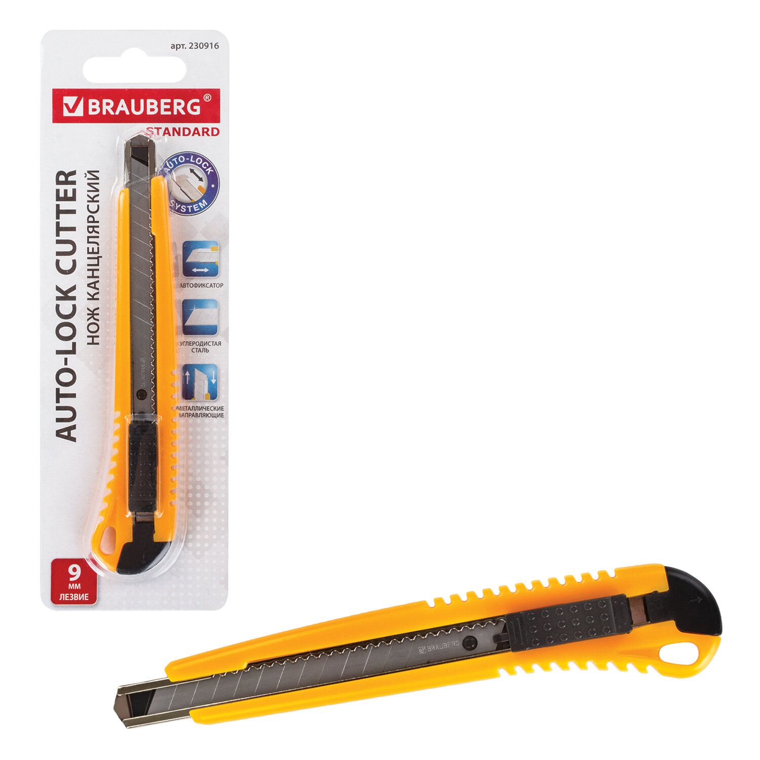 Канцелярский нож BRAUBERG «Standard» – инструмент, незаменимый как в офисе, так и в быту. С его помощью можно аккуратно разрезать бумагу, картон и т.д. Подходит для периодических нерегулярных задач, но также справляется с большим объемом материала.За счет автофиксатора канцелярский нож удерживает лезвие шириной 9 мм в нужном положении, что особенно важно при длительной работе. Если конец лезвия затупился, его всегда можно удалить, аккуратно отделив по контрольной линии. Дополнительные лезвия приобретаются отдельно. Жесткие металлические направляющие оберегают руки от случайного соприкосновения с острым режущим краем. Не нанесут вреда при соблюдении стандартных правил техники безопасности. Для удобство имеется отверстие для подвеса. Упаковка - блистер с европодвесом. Поставляется в нескольких вариантах цвета (без возможности выбора).Ширина лезвия: 9 мм. Серия: Standard. Тип механизма фиксации: система блокировки лезвия. Материал корпуса: пластик. Наличие металлических направляющих: да. Отверстие для подвеса: да. Цвет корпуса: ассорти. Упаковка: блистер с европодвесом Бренд - BRAUBERG. Производитель - Китай. Артикул - 230916. Штрихкод - 4606224006994