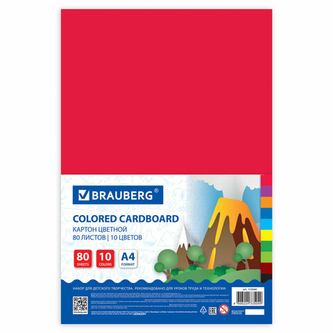 Картон цветной А4 немелованный, 80 листов, 10 цветов, в коробке, BRAUBERG, 200х290 мм, 113560 немелованный в коробке