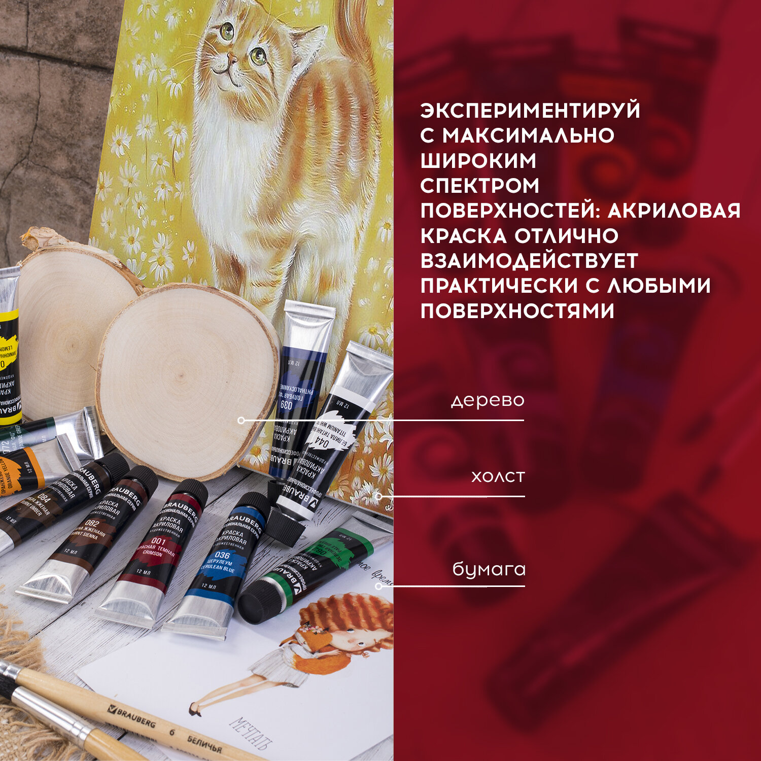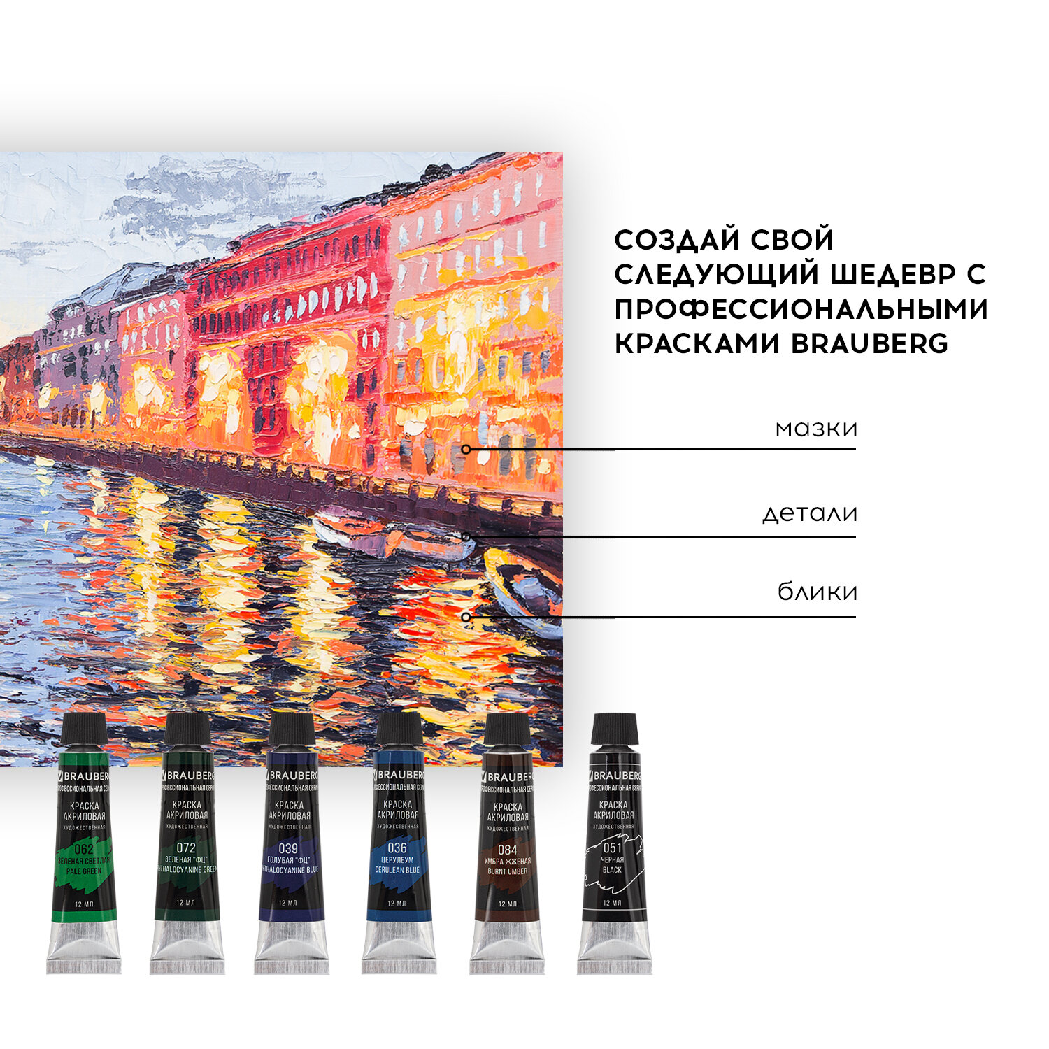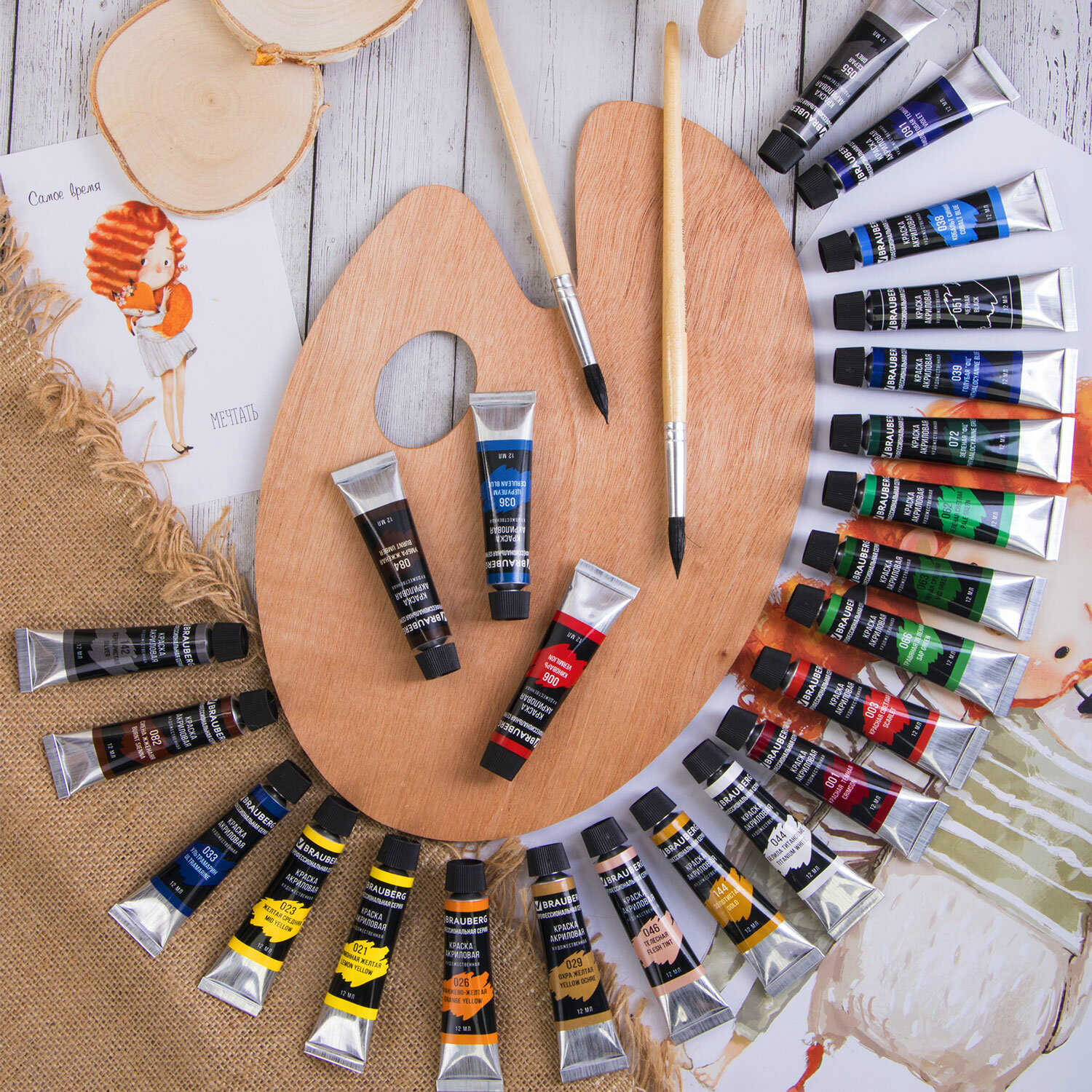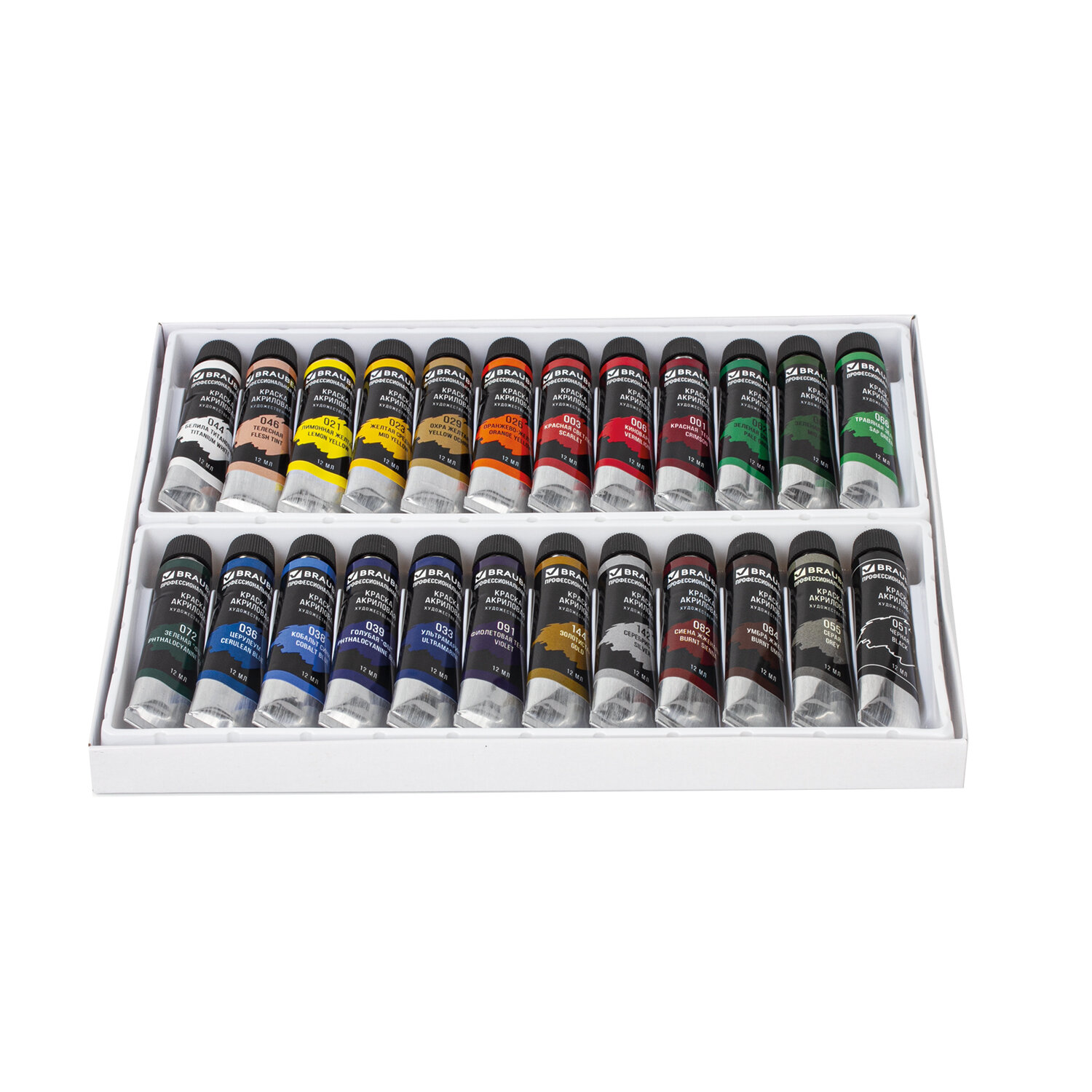 Художественные акриловые краски BRAUBERG ART "CLASSIC" предназначены для живописи и декоративных работ. Профессиональная серия.<br>Художественные акриловые краски BRAUBERG ART "CLASSIC" предназначены для живописи и декоративных работ. Профессиональная серия.Легко наносятся практически на любую поверхность. Быстрое высыхание без изменения цвета. Отличная укрывистость и светостойкость. Разбавляются водой. Не токсичны и не имеют неприятного резкого запаха. Краски поставляются в тубе объемом 12 мл в картонной коробке.24 ярких и насыщенных цвета:- белила титановые (044); - телесная (046);- лимонная желтая (021);- желтая средняя (023); - охра желтая (029);- красная светлая (003); - киноварь (006);- оранжево-желтая (026);- красная темная (001); - зеленая светлая (062);- зеленая средняя (063);- зеленая "ФЦ" (072); - травяная зеленая (066); - ультрамарин (033);- церулеум (036); - кобальт синий (038); - голубая "ФЦ" (039);- фиолетовая темная (091); - серебристая (142); - золотистая (144);- сиена жженая (082); - умбра жженая (084); - серая (055); - черная (051).<br>Художественные акриловые краски BRAUBERG ART "CLASSIC" предназначены для живописи и декоративных работ. Профессиональная серия.Легко наносятся практически на любую поверхность. Быстрое высыхание без изменения цвета. Отличная укрывистость и светостойкость. Разбавляются водой. Не токсичны и не имеют неприятного резкого запаха. Краски поставляются в тубе объемом 12 мл в картонной коробке.24 ярких и насыщенных цвета:- белила титановые (044); - телесная (046);- лимонная желтая (021);- желтая средняя (023); - охра желтая (029);- красная светлая (003); - киноварь (006);- оранжево-желтая (026);- красная темная (001); - зеленая светлая (062);- зеленая средняя (063);- зеленая "ФЦ" (072); - травяная зеленая (066); - ультрамарин (033);- церулеум (036); - кобальт синий (038); - голубая "ФЦ" (039);- фиолетовая темная (091); - серебристая (142); - золотистая (144);- сиена жженая (082); - умбра жженая (084); - серая (055); - черная (051).Количество цветов в наборе: 24. Серия: Classic. Тип фасовки: туба. Объем: 12 мл. Спецэффект цвета: глянцевый. Цвет: белила титановые (044), голубой ФЦ (039), желтая средняя (023), зеленый светлый (062), зеленый средний (063), зеленый ФЦ (072), золотистый (144), киноварь (006), кобальт синий (038), красная светлая (003), красная темная (001), лимонная желтая (021), оранжево-желтый (026), охра желтая (029), серебристый (142), серый (055), сиена жженая (082), телесный (046), травяной зеленый (066), ультрамарин (033), умбра жженая (084), фиолетовый темный (091), церулеум (036), черный (051). Тип краски: акриловые художественные. Упаковка: картонная коробка Бренд - BRAUBERG. Производитель - Китай. Артикул - 191124. Штрихкод - 4606224144214