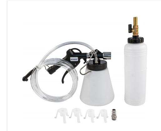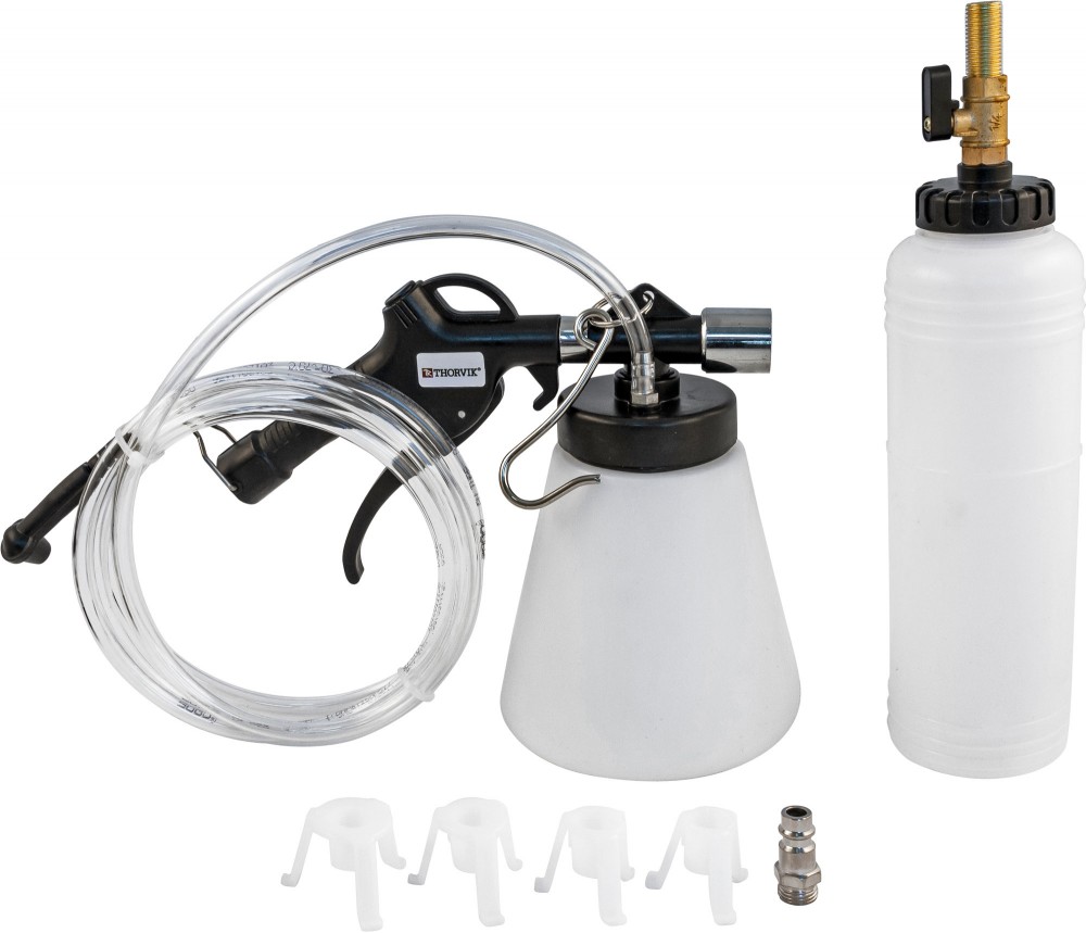 ПРИСПОСОБЛЕНИЕ ПРЕДСТАВЛЯЕТ СОБОЙ УСТРОЙСТВО, С ПОМОЩЬЮ КОТОРОГО ОСУЩЕСТВЛЯЕТСЯ ПРОИЗВОДСТВО РАБОТ ПО ОПРЕССОВКЕ (ПРОКАЧКЕ) ГИДРАВЛИЧЕСКИХ КОНТУРОВ ПРИВОДОВ ТОРМОЗНЫХ МЕХАНИЗМОВ, РАБОЧИХ ЦИЛИНДРОВ ПРИВОДОВ СЦЕПЛЕНИЯ И ЗАМЕНЕ РАБОЧИХ ЖИДКОСТЕЙ. СОДЕРЖАНИЕ: Емкость для заправочной жидкости, 1.0 л., Емкость для слива отработанной жидкости в сборе с вакуумным пистолетом, Шланг прозрачный в сборе, Переходники, 4 шт.: 25/32’’ – 1-7/32’’ (21–30 мм), 31/32’’ – 1-1/4’’ (24–32 мм), 1-3/32’’ – 1-15/32’’ (28–37 мм), 1-1/4’’ – 1-19/32’’ (32–41 мм).