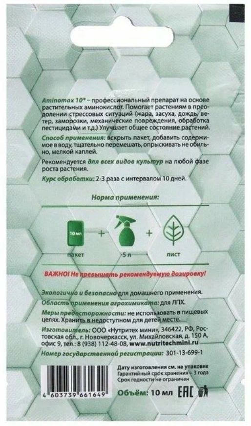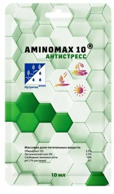 Aminomax 10 — это профессиональный препарат для компенсации стрессовых воздействий у растений. Он содержит специально разработанную жидкую формулу на основе растительных аминокислот, которые полностью усваиваются и помогают растению справляться со стрессом. Aminomax 10 обладает высокой скоростью проникновения и активизирует процессы восстановления и роста растений. Применяется для листовой подкормки всех сельскохозяйственных культур на всех стадиях вегетационного периода. Способ применения: вскрыть пакет, добавить содержимое в воду, тщательно перемешать и опрыскивать растения мелкой каплей. Курс обработки — 2–3 раза с интервалом 10 дней. Норма применения — 10 мл на 5 л воды. Не превышайте рекомендуемую дозировку!